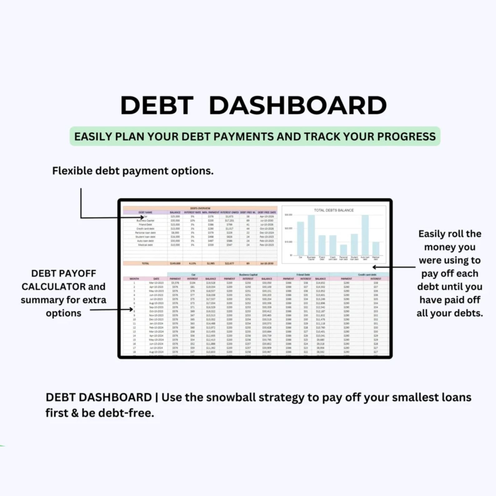 💳 Debt Dashboard & Calculator: A powerful tool to track debts and choose from multiple repayment strategies.
