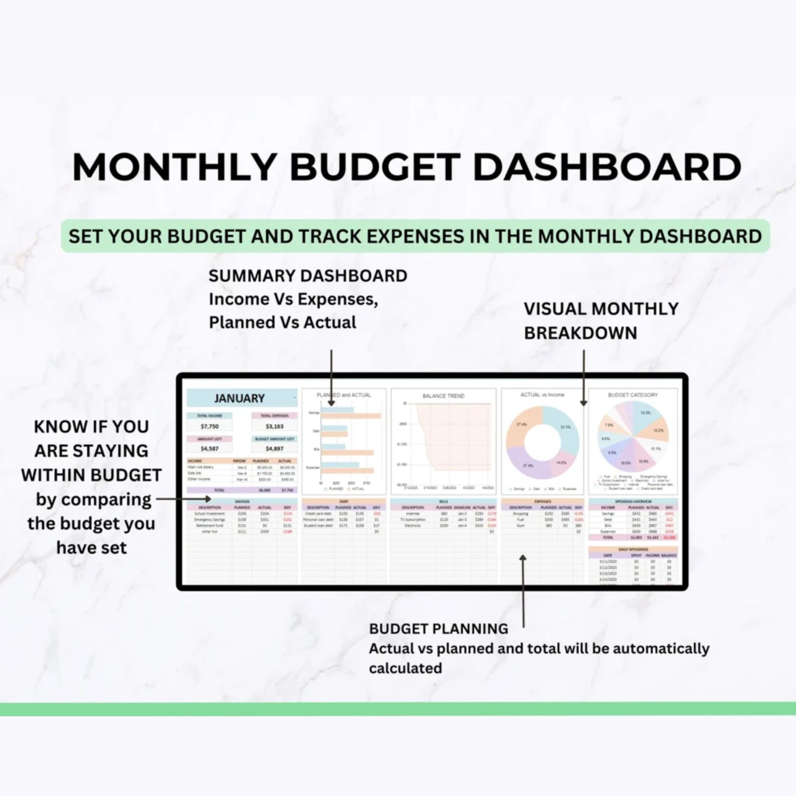 📅 Monthly Budget: Begin any month and plan your budget by recording transactions like income, bills, expenses, savings, investments, and debt.
