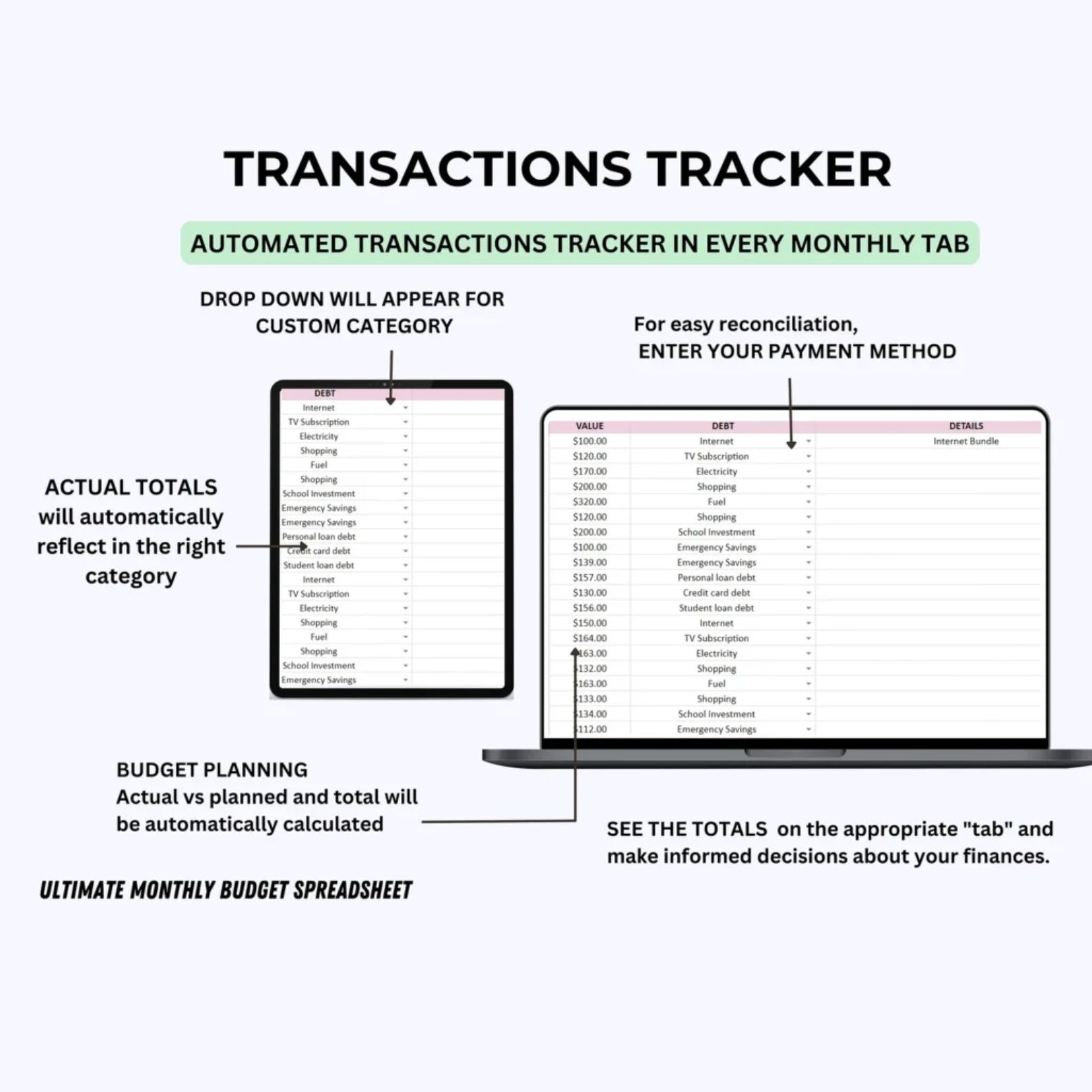 📊 Transaction Tracker: Built-in tracker for both income and expenses in each monthly tab.